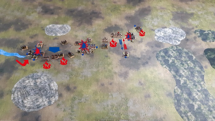 Ein Numidischer Reiterverband der Karthager umritt schließlich das unebene Gelände und suchte nach einem Ziel im Rücken der römischen Armee, während ein anderer Verband zusammen mit den Keltiberischen Reitern die römischen Velites im Gelände konzertiert attackierte. Diese wehrten sich tapfer, mussten sich aber der Übermacht beugen. Auch am anderen Ende des unebenen Geländes wurden die Velites von den Spanischen Scutarii der Karthager geschlagen, während die Latinische Infanterie der Römer tapfer weiterkämpfte. Zumindest ist es ihnen bis hierhin gelungen, die linke Flanke der römischen Hauptinfanterielinie zu beschützen. Auf der rechten Seite konnten sich die römischen Equites gegen ihre karthagischen berittenen Widersacher durchsetzen, sahen sich aber dem fortdauerndem Beschuss durch die Balearischen Schleuderer ausgesetzt, die schließlich doch noch eine Einheit Equites ausschalten konnten - ein empfindlicher Verlust.