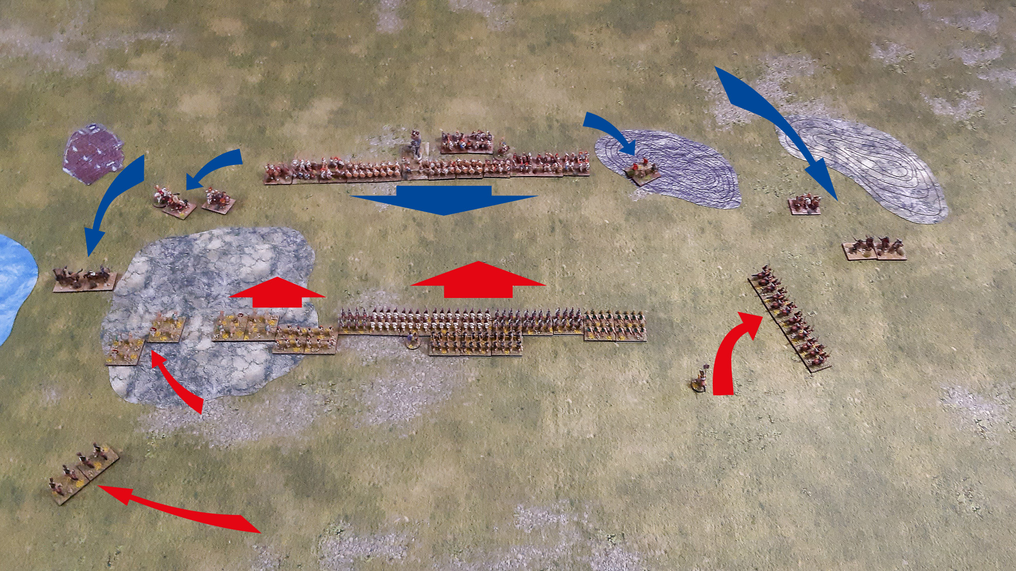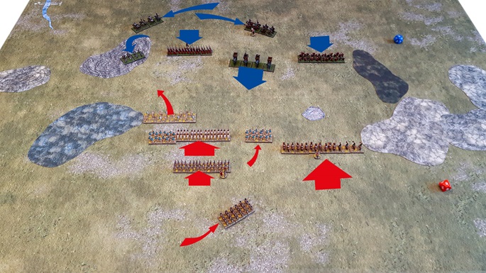 (2) Umgruppierungen und Gegenmaßnahmen. Und tatsächlich, gleich zu Beginn überraschte die karthagische Armeeführung durch eine umfassende, in dieser Konsequenz selten beobachteten taktische Rochade: Die Elefanten schwenkten in Kolonnenformation geschlossen nach rechts ab, während die Ligurier zum Gegenschwenk auf den linken Flügel antraten. Die zentrale Keltiberische Reiterei verlagerte sich in vollem Galopp an die äußerste rechte Flanke bis an den Rand des dortigen Teichs, eskortiert von den Balearischen Schleuderern. Die Mehrheit der Numidischen Reiterei zog ebenfalls nach rechts ab, bis auf einen kleinen Stoßtrupp, der im Zentrum verblieb. Die Spanischen Scutarii marschierten zügig auf das Waldgebiet vor, während einzig die Lybischen Veteranen ihre Richtung stoisch direkt auf den Feind beibehielten, ohne Verlagerung.