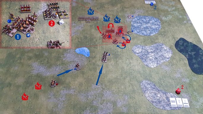 An der mit (2) markierten Stelle fiel schließlich die Entscheidung. Hier wurde eine Einheit seleukidischer Kavallerie, die von einem General begleitet wurde, von drei Seiten flankiert und umzingelt. Die Einheit überlebte das Massaker erwartungsgemäß nicht, doch fataler für die Seleukiden erwies sich das Schicksal ihres Generals, der mit seiner Einheit fiel! (Der Ausschnitt zeigt den Augenblick, als die "1" gewürfelt wurde, das denkbar ungünstigste Ergebnis für den Schicksalswurf eines Generals.)