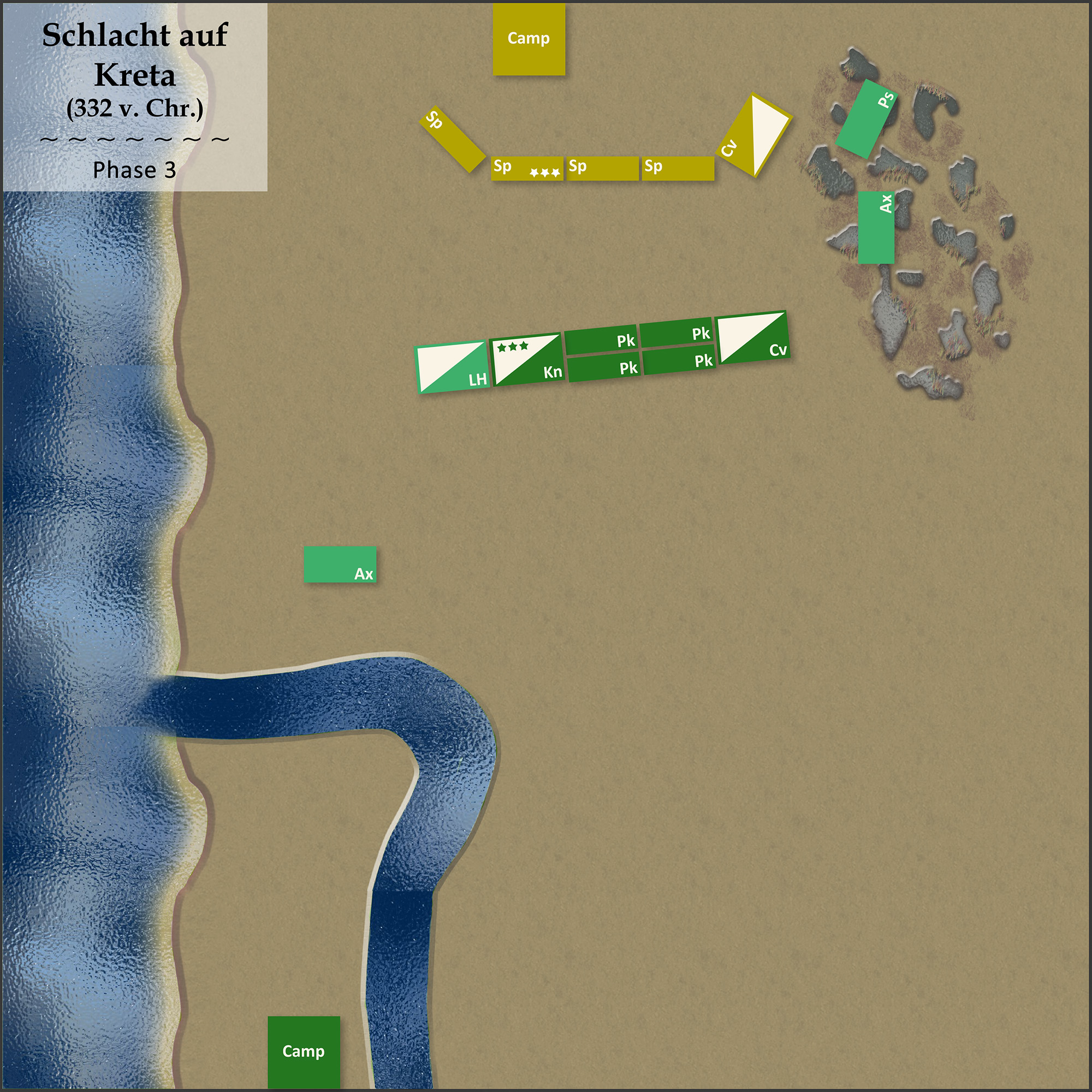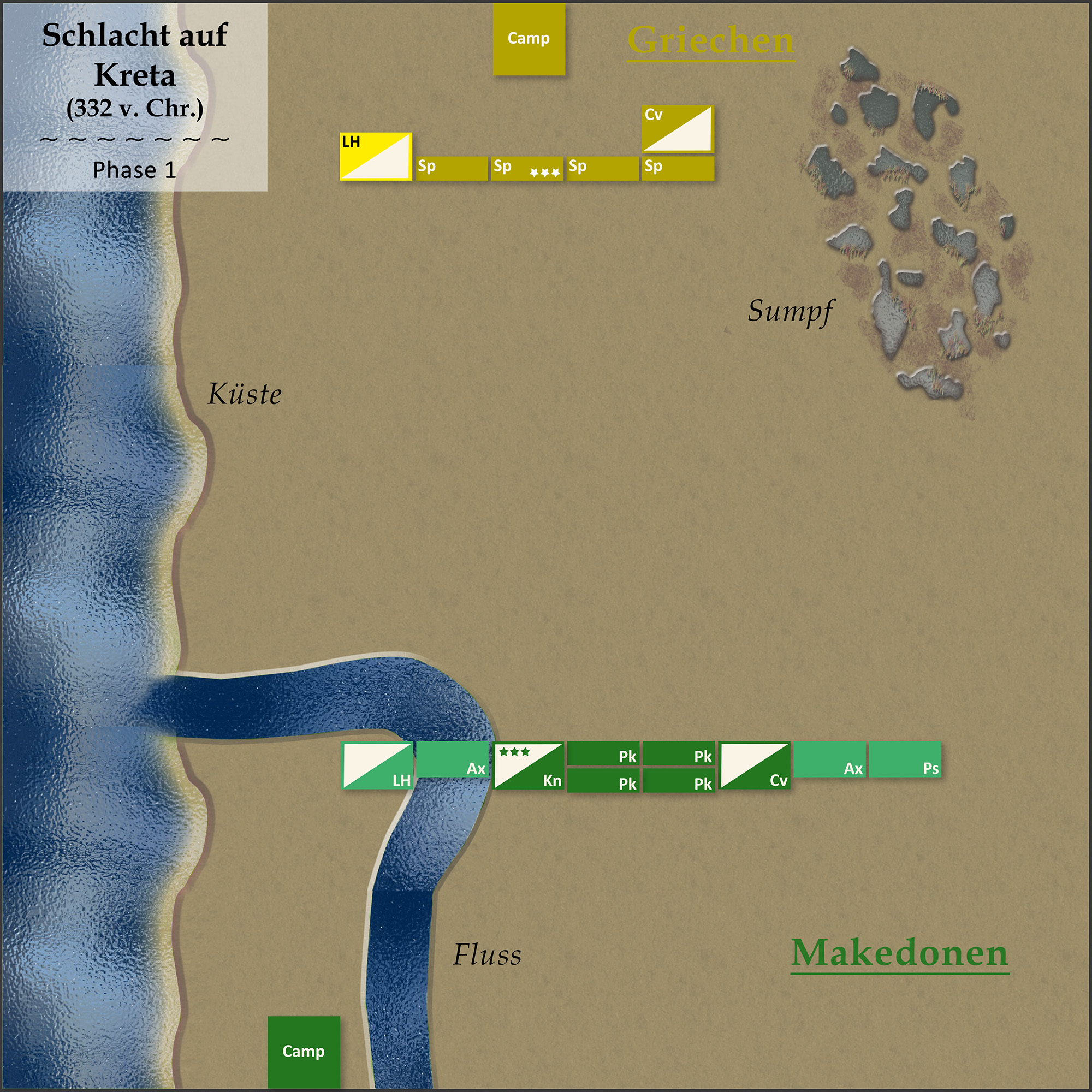 (1) Die verteidigenden Griechen wählten als Gelände eine Küstenlinie, die das Schlachtfeld verengte, sowie einen Fluss und einen Sumpf. Die Makedonen entschieden sich, von der Schlachtfeldseite mit dem Fluss aus anzugreifen, um den Griechen die Möglichkeit zu nehmen, ihre numerisch kleinere Armee hinter dem Fluss zu verschanzen. (Welcher sich jedoch nach dem initialen Würfelwurf sowieso als leicht durchwatbar erwies.) Die Griechen stellten ihre Truppen zuerst auf. Sie bildeten eine Linie, mit den Hopliten (Sp) im Zentrum (darunter ihr C-in-C), der leichten Kavallerie (LH) auf dem linken (hier und im Folgenden aus makedonischer Perspektive) Flügel und der regulären Kavallerie (Cv), in zweiter Reihe hinter den Fußtruppen, auf dem rechten Flügel. Die Makedonen stellten ihre Armee ebenfalls in einer Linie auf. Links außen, hinter dem Fluss, stand die leichte Kavallerie (LH), im Fluss selbst standen die Hypaspisten (Ax), daneben positionierte sich der C-in-C Alexander mit seinen "Gefährten" (Kn), gefolgt von der Phalanx (Pk) sowie auf dem rechten Flügel die Thraker (Ax) und die Plänkler (Ps).
