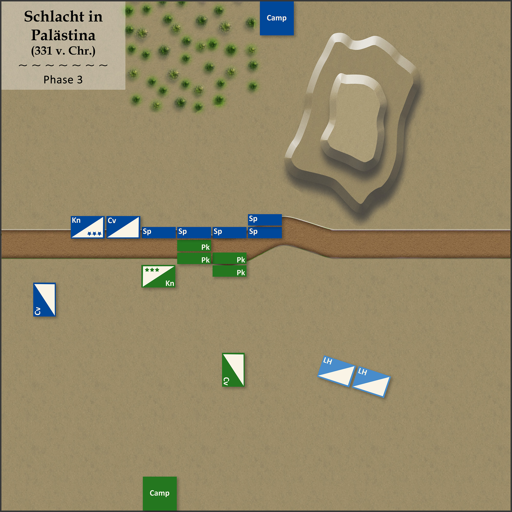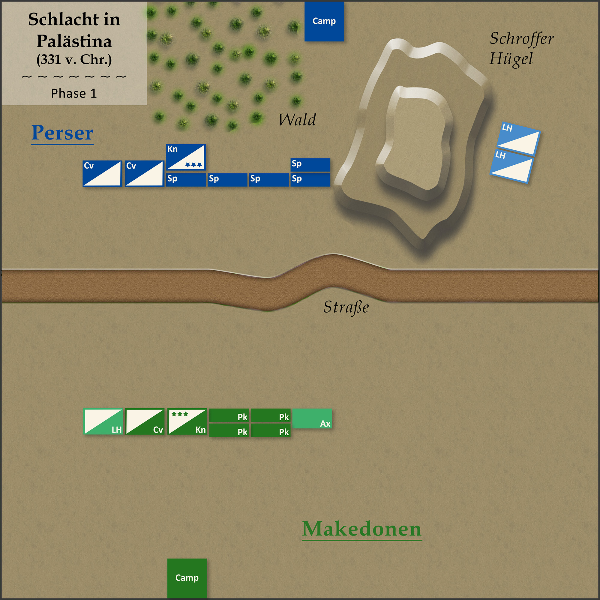 Die Perser positionierten den Hauptteil ihrer Armee mit dem Wald im Rücken direkt der makedonischen Armee gegenüber. Am Hügel verankerten sie die rechte (hier und im Folgenden aus Blickrichtung der Makedonen) Flanke ihrer Linie aus Speerkämpfern (Sp), auf dem linken Flügel nahm die Reiterei - zwei Verbände medischer Kavallerie und, hinter der Infanterie versetzt, der C-in-C mit Panzerreitern. Auf der anderen Seite des Hügels standen zwei Einheiten leichter Reiterei (LH).