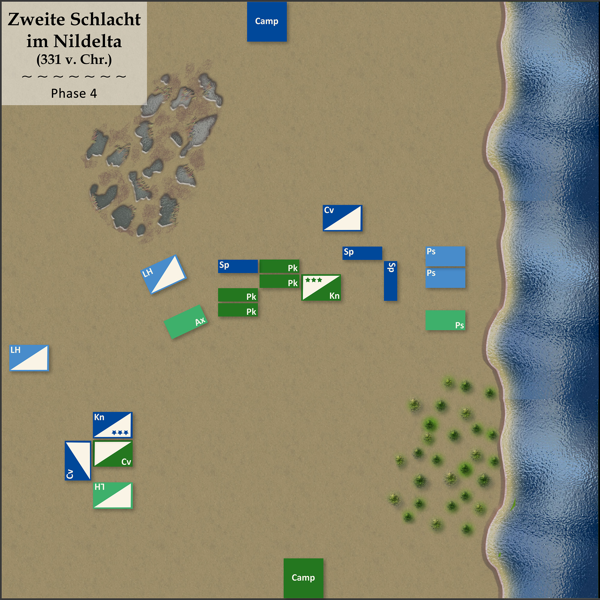 (4) Die Schlacht endete mit einem Sieg der Perser, nachdem der makedonische C-in-C infolge eines unglücklichen Kampfergebnisses von seinem persischen Kontrahenten vernichtet wurde (dies war der dritte Verlust eines makedonischen Generals in einer Schlacht!). Der Weg war nun frei für den C-in-C der Perser, durch die Lücke hindurchzureiten und der makedonischen Phalanx in den Rücken zu fallen. Und auch auf dem linken Flügel wurden die Makedonen schließlich im Rücken attackiert. Auf dem linken Flügel hatten die Makedonen kurz zuvor erfolglos versucht, die persische Flanke vom Sumpf aus aufzureiben.